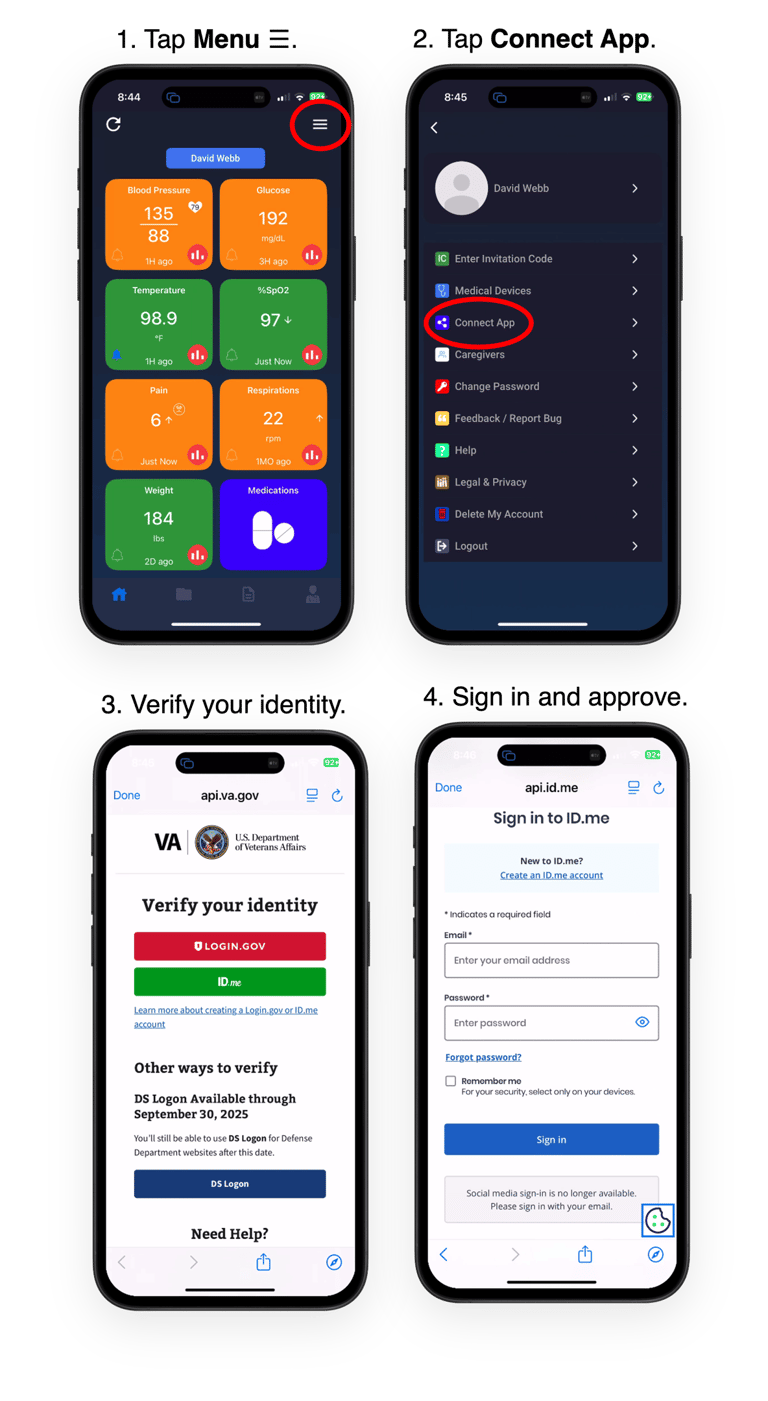 One of the most powerful features of Vet mHealth is its ability to connect directly with your VA.gov account. Using the VA’s Patient Health APIs, we can download your official VA health data right into the Vet mHealth app. Once connected, you’ll be able to combine that information with vitals, medications, and observations you track daily—giving you a smarter, more connected way to manage your care.