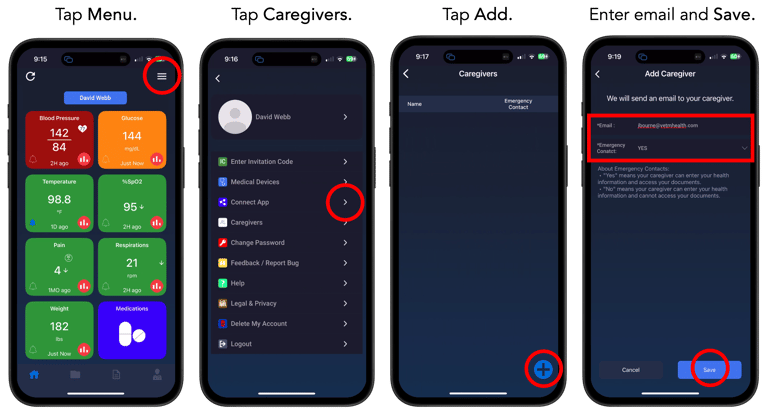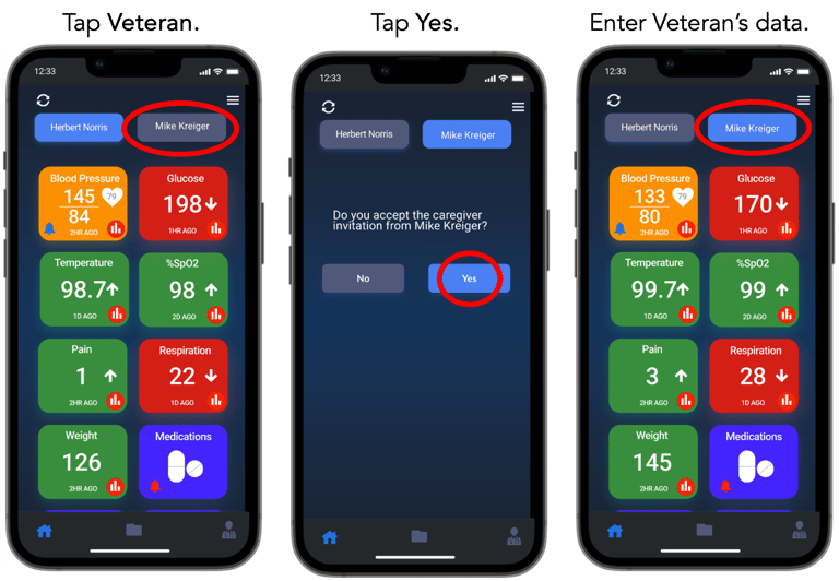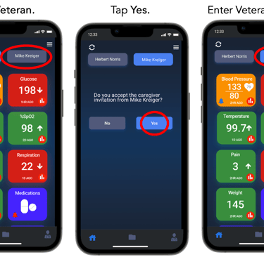 The Vet mHealth app allows Veterans to easily invite their authorized caregiver via email to enter health information for them.
